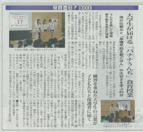 1月24日(土)に行われた跡見学園女子大学の学生講師による授業が行われ、日本教育新聞社の取材を受けました。当日の様子は、「大学生が届ける『バナナうんち』食育授業~体の仕組と『早寝早起き朝ごはん』の大切さを学ぶ45分」と題し、2026年2月9日発行の日本教育新聞に掲載されています。参加した子たちからの感想のほか、「大学生ならではの親しみやすさにより授業の効果が高められた」との小学校の先生からのコメント、跡見学園女子大学の学生の感想や石渡教授のコメントも紹介されています。