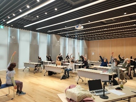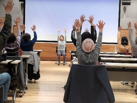 ◯ 先ずは、「呼吸、背骨、肩甲骨、骨盤の動きの大切さ」について、並びに ご説明の後は、『簡単エクササイズ&ストレッチ』を行ないました。 (大崎市地域交流センター様 第3回 出前講座のようす)