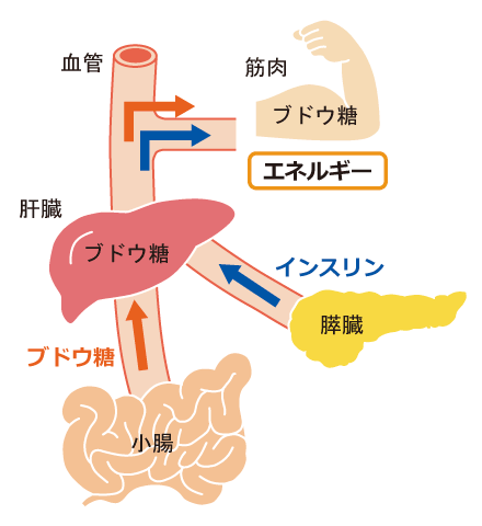 通常、体内に取り入れられたブドウ糖は小腸で吸収され肝臓に運ばれ、その後エネルギー源になります。このとき、膵臓からインスリンというホルモンが分泌され、ブドウ糖を全身の細胞や筋肉にエネルギー源として運んでいます。ところが、インスリンが十分に分泌されなかったり働きが悪かったりすると、ブドウ糖をうまくエネルギー源に変えることができず、血糖値が高い状態が続きます。これが糖尿病です。