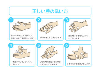 外出後、食事の前、咳やくしゃみをした後など、石けんを使用し指の間や手首までしっかりと洗い、その後うがいを行います。実は、この順番も重要です。手に付いた見ないウイルスや菌が付いた手で、コップなどに触れると口の中に入るリスクが高まるためです。