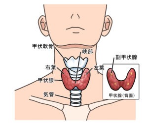 甲状腺とは内分泌器官のひとつで、イラストの通り、首の前側、喉仏のすぐ下にあり、蝶が羽を広げたような形をしており、気管を抱き込むように存在します。